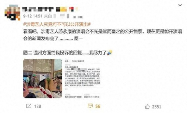 近日,有博主反映称,他向温州市相关部门投诉了苏永康将开演唱会一事,诉求停止该艺人在温州的演唱会。他发布的截图显示,龙湾区文化和广电旅游体育局答复工单称,该演出活动经审核同意,材料齐全,程序符合要求,批准同意演出。公开资料显示,2002年,苏永康在酒吧因藏有毒品被捕,之后入狱强制勒戒11天即出狱。