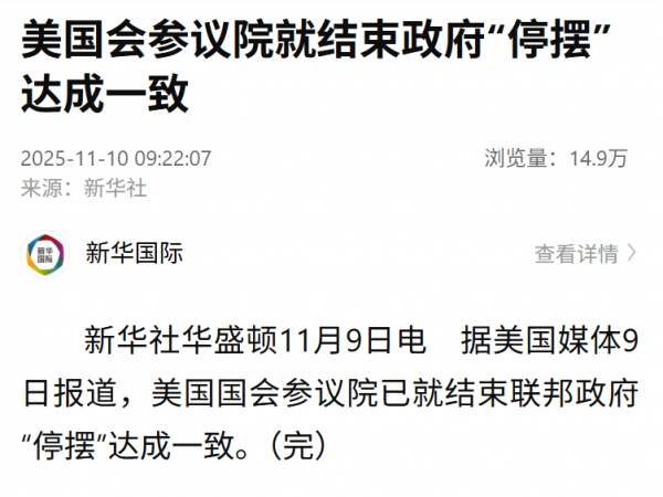 据美国媒体9日报道,美国国会参议院已就结束联邦政府"停摆"达成一致。