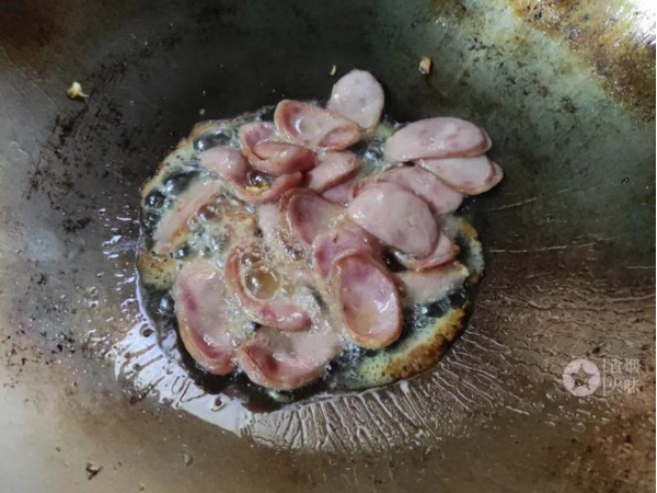2.热锅中加入适量的油,油热把切好的香肠倒入炒出香味来。这种香肠炒得焦香吃起来的味道更棒。