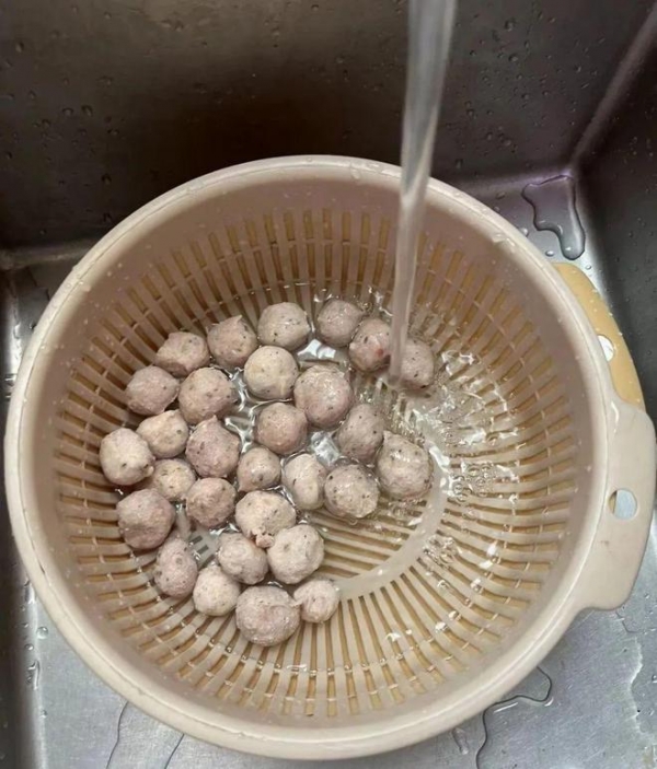 2.丸子取出放水中洗净,洗净放一旁。生姜要放在流动水中冲洗干净,洗生姜的时候注意缝隙,洗好后切片放旁边;