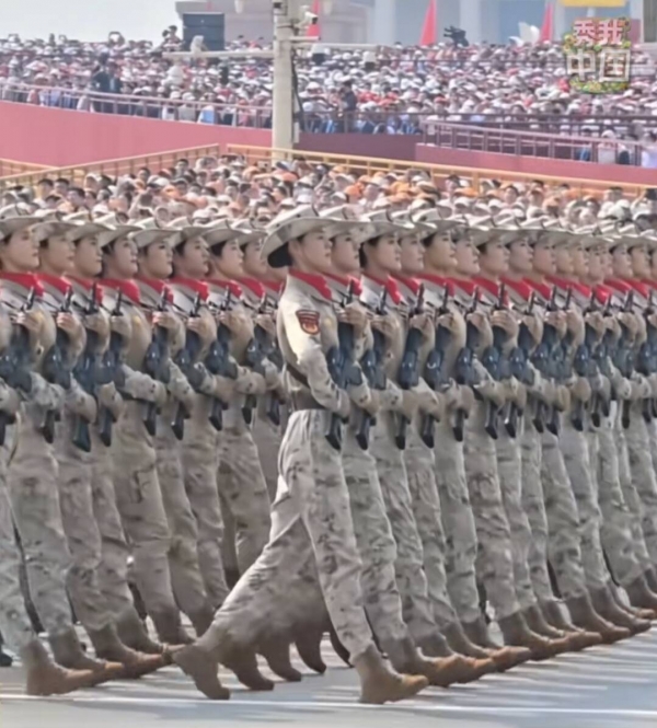当身着21式荒漠迷彩蛙服的女民兵方阵走过天安门城楼前时,随着领队一声响亮清脆地"向右看",所有队员整齐摆头,目光如注看向阅兵台,看到这一瞬间太激动了,脑海中蹦出四个字,英姿飒爽!