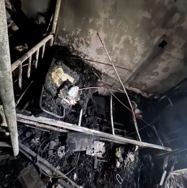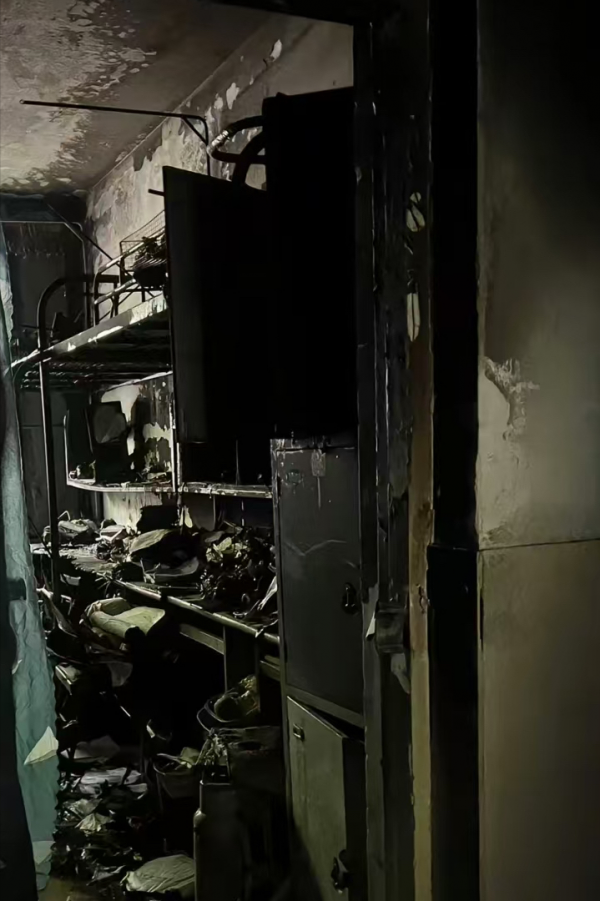 此次火情中,每个宿舍虽然都有烟雾报警器和消防喷洒系统,但从始至终宿舍里的喷洒系统也没有启动,是宿舍楼的设备老化失修?还是摆在表面的面子工程?火情之后的宿舍,木质床板早已被烧成灰烬,只剩一副焦黑的铁架,房间内墙壁均被烧至黑白色。