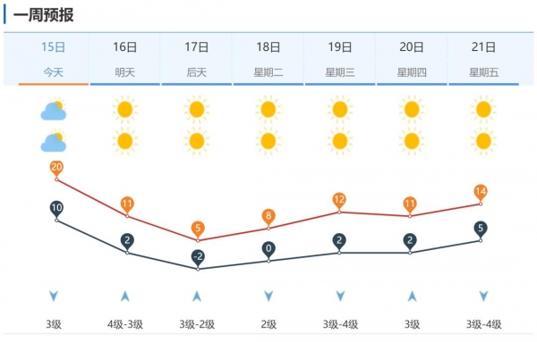 最低气温出现在18日早晨,鲁中山区-6~-4℃,沿海地区1~4℃,其他地区-4~-2℃。16-17日,北风,滨州、东营、潍坊、日照、半岛地区和内陆湖面5~6级阵风7~8级减弱到4~5级阵风6~7级,其他地区4~5级阵风7级减弱到3~4级。