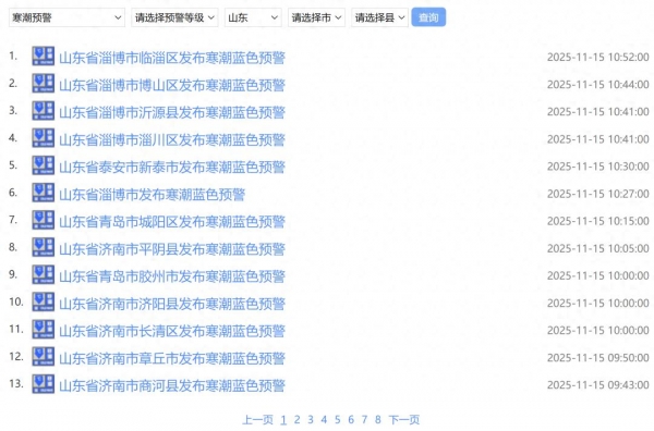 济南市气象台于2025年11月15日9时30分发布寒潮蓝色预警: