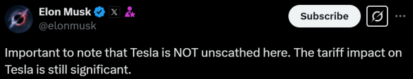 当天晚些时候,特朗普的亲密顾问、特斯拉首席执行官埃隆·马斯克在X平台上为一则相关消息发布评论说,"值得注意的是,特斯拉并非毫发无损(NOT unscathed)。关税对特斯拉的影响仍然重大"。