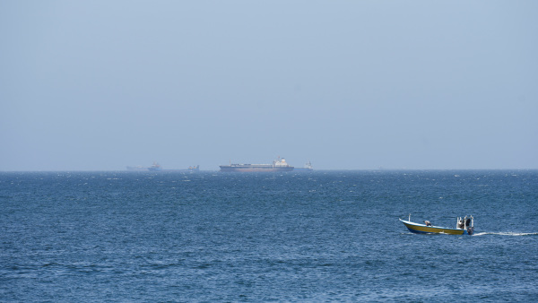 当地时间2026年4月8日,从阿曼穆桑代姆省眺望霍尔木兹海峡,船只停泊在海岸附近。 IC photo