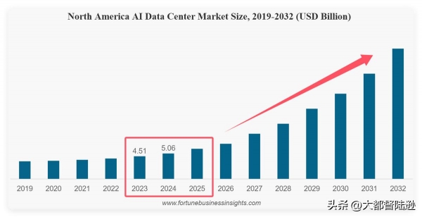 北美AI数据中心市场规模,2019-2032年(十亿美元)