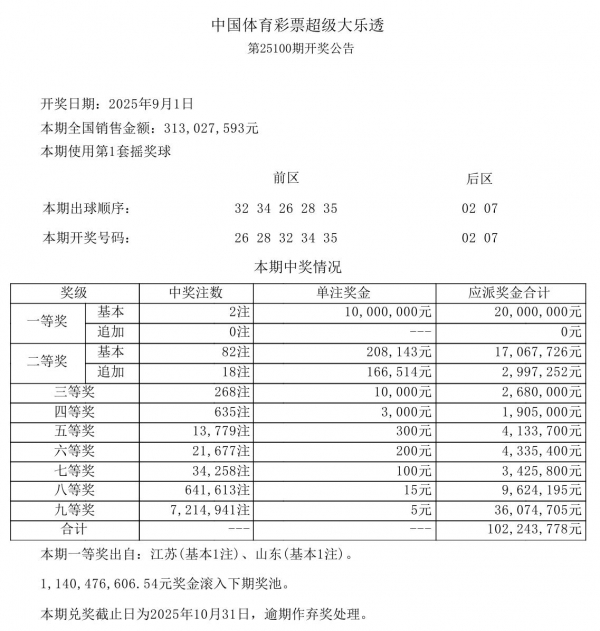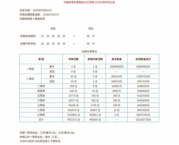 北京时间2025年9月1日大乐透第25100期开奖,本期全国开出2注一等奖(都未追加投注)单注奖金高达1000万,其中山东潍坊彩民和江苏彩民各中1注一等奖;二等奖开出82注单注奖金208143元,追加18注单注奖金166514元;三等奖开出268注单注奖金10000元;四等奖开出635注单注奖金3000元!