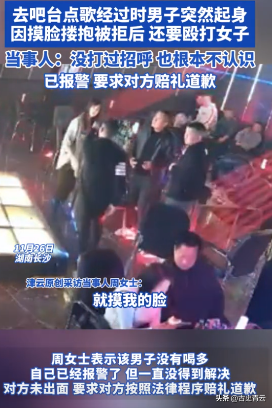 11月26日,湖南长沙,一女子在酒吧遭陌生男子摸头后报警。女子称甩开对方后,男子竟还想动手,幸好被朋友拉开。警方初步调查认为男子酒后挑衅,目前事件正在处理中。