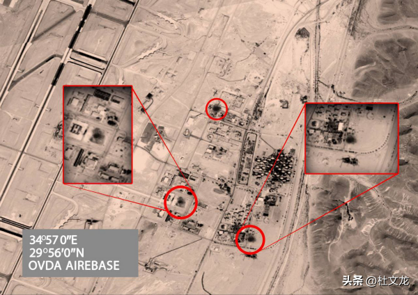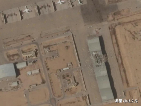另外非加固机库,一个长方形的面积较大的机库顶部,被炸开了3到4米的洞,如果里边有F-35在维护,包括有其他的F-35相关设施也一定会遭到摧毁。另外在停机坪也有导弹的落点,距加油机大概在50米左右爆炸冲击波,势必会对加油机产生一定影响。另外就是跑道有多处遭到损毁,联络道也有多处有弹坑,说明这个打击行动,基本上把南部停放F-35战斗机和F-16、F-15战机的基地进行全覆盖。