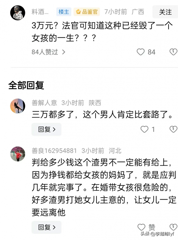 不过有不少网友觉得,赔偿3万元左右,实在是太少了,马某某的行为,已经彻底的毁掉了女孩的一生。