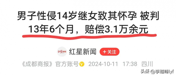 根据红星新闻10月11日的报道,男子性侵14岁的继女导致其怀孕,被判处有期徒刑13年6个月,赔偿3.1万余元。