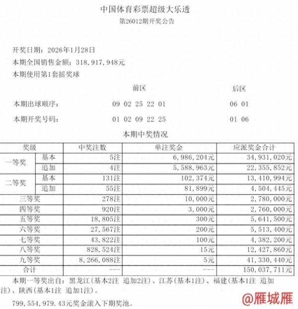 本期一等奖分落:黑龙江(基本2注 追加2注),福建(基本1注 追加1注),陕西(基本1注 追加1注), 江苏(基本1注),一共5注。
