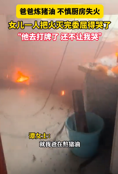女儿就把锅盖盖在油锅上,然后一盆水就直接把油锅给浇灭了,又弄了一盆水把油烟机上面的那个火给浇灭了。