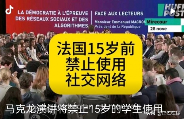 马克龙称:青少年大脑与情绪未成熟,易受社媒算法与不良内容伤害 。