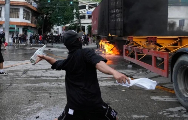 从现场视频来看,这场抗议确实激烈,但最"热闹的"地方,还是在首都马尼拉,尤其是总统府门前。他们主力多为年轻人,向防暴警察投掷石块和燃烧瓶,还点燃路上的一辆重型卡车,警方则用催泪弹和水炮驱散群众,现场一片混乱。说到这里就不得不提一句,菲律宾这次可算是强硬起来,还动用了水炮,结果居然是对准国内反腐败的民众抗议,实在难评。
