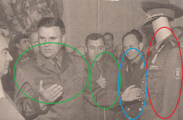1993年时任乌国防部长拉德茨基(左前绿圈)视察新军装设计。可以看到,当时乌克兰也设计了继承M91、与俄M94相似的"节俭版"将官服(红圈内),但方案最终被高层否决