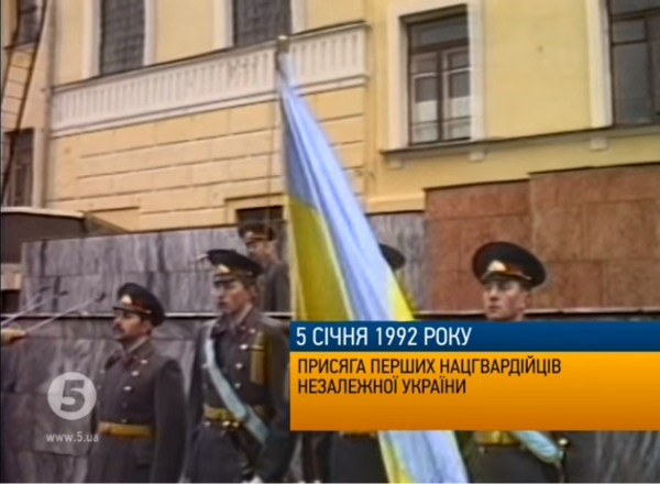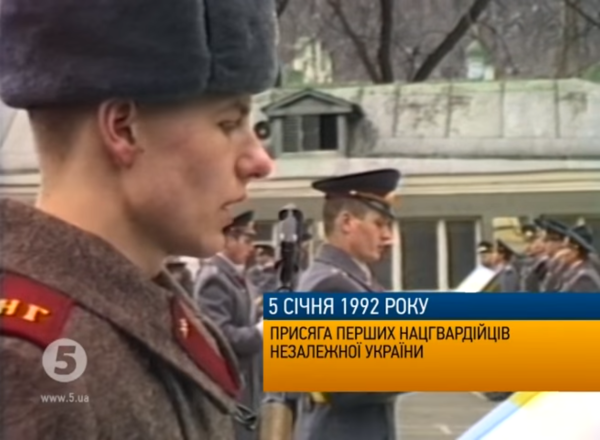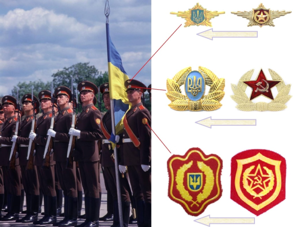 第一个月的乌军官兵,仍穿着完整M69军服、头顶缀着镰刀锤子红星帽徽、肩扛"苏军"(СА)肩章,同时举着黄蓝国旗和带列宁头像的军旗。目前已知的第一种由乌政府自行设计制作的乌军标志服饰,是1992年1月5日在苏军驻乌内卫某部改编为"乌克兰国民近卫军"(Національна Гвардія України,乌克兰共和国1991年底自行立法设立)的仪式上,发放的两块暗红色矩形士兵肩章: