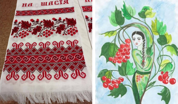 (左)乌克兰绣(вишивка)上的红荚蒾图案;(右)童话故事--荚蒾箫
