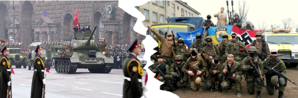 2004年乌克兰纪念苏联解放60周年大阅兵(左);2014年左右的乌顿巴斯亚速营纳粹分子(右)