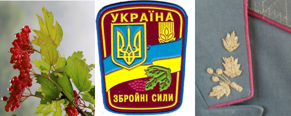 红荚蒾浆果(左);1993-2016年的乌克兰陆军标准臂章(中);同期乌军警(及其他着制服的政府和哥萨克协会系统)将官服领口的金肖绣荚蒾果叶形象(右)