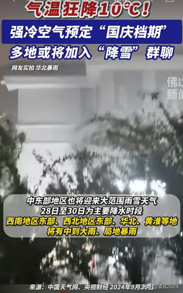 9月27日开始一股酝酿已久的强冷空气,将带来雨、雪、大风、强降温等"组合天气",预计,北方地区普遍有4℃到8℃降温,西北地区、内蒙古、东北部分地区降温幅度有10-12℃,局地超过14℃。