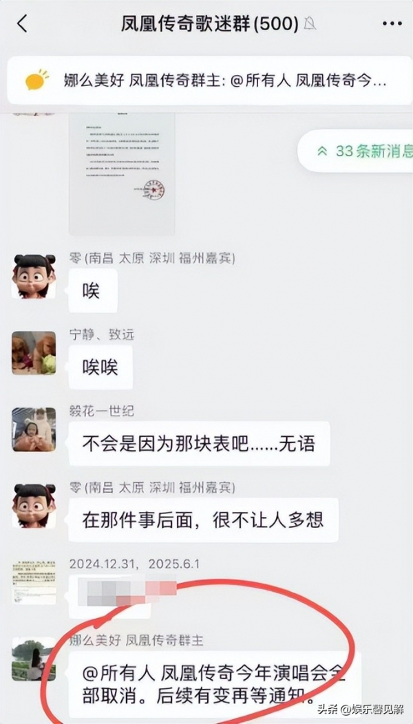 除此之外,还有凤凰传奇歌迷群的一张聊天截图,当时很多歌迷都对演唱会取消感到惋惜,群主却发布了群公告,称"凤凰传奇今年演唱会全部取消"。