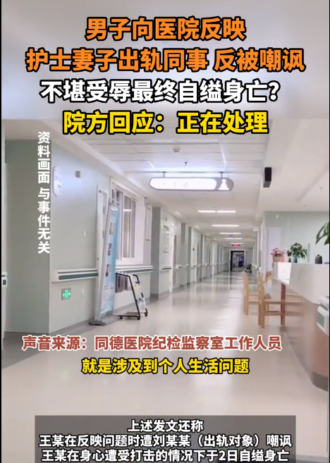 明明是护士妻子,背叛婚姻出轨同科室的医生,丈夫在得知真相后,就想着去妻子的工作单位讨个说法,这其实是一件很正常不过的事情,可却因医院的"冷漠对待"和他人的闲言碎语,让一个大老爷们一时想不开,选择留下遗书自缢了。