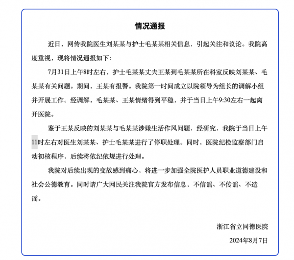 不仅如此,医院还表示,在7月31日上午11时就对涉事医生刘某某以及护士毛某某进行了停职处理,并依法进行核查程序。