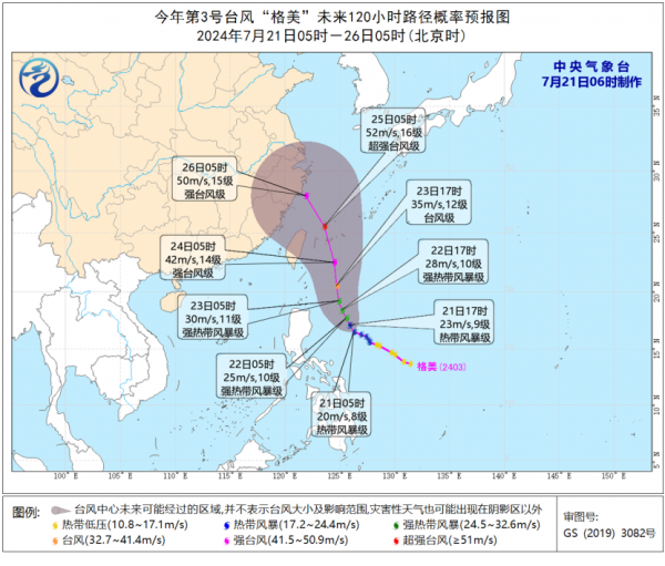 预计,"格美"将以每小时10公里左右的速度向北偏西方向缓慢移动,强度逐渐增强,最强可达强台风级或超强台风级(50~52米/秒,15~16级),并逐渐向台湾岛东部海面靠近。