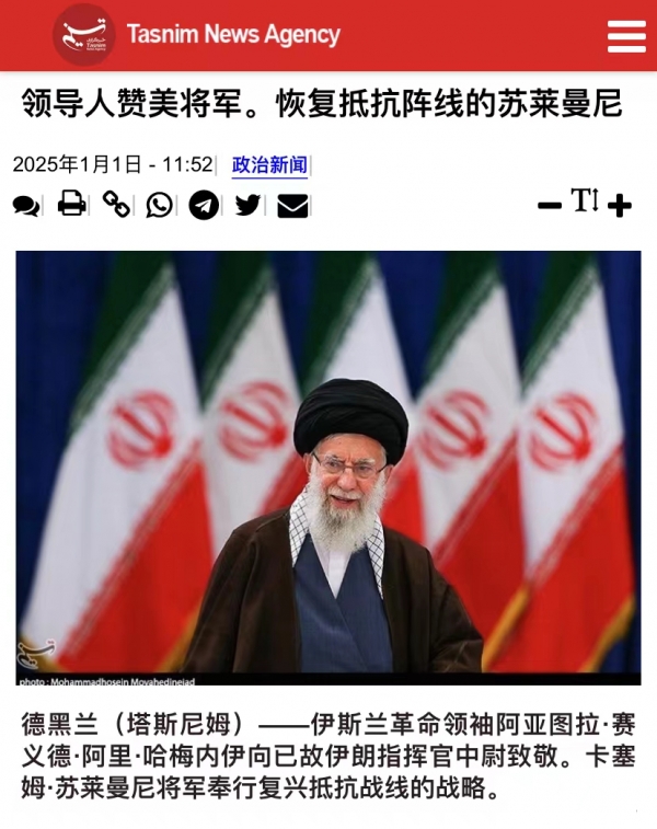 2025年新年到来之际,1月1日,哈梅内伊在德黑兰举行了一个纪念革命卫队圣城旅前指挥官索莱曼尼被美国刺杀5周年的纪念仪式。