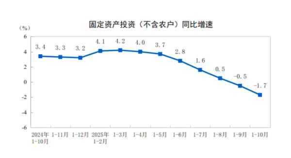 1-10月份,全国固定资产投资(不含农户)408914亿元,同比下降1.7%。其中,民间固定资产投资同比下降4.5%。从环比看,10月份固定资产投资(不含农户)下降1.62%。