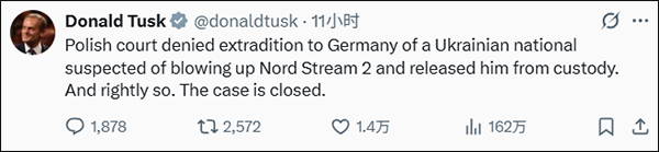 波兰总理图斯克随后在X平台上表示,这一裁决"合理",并对法院的决定表示支持。他称,"波兰法院已拒绝将涉嫌破坏'北溪-2'管道的乌克兰籍嫌疑人引渡至德国,并已将其释放。这样做是正确的,此事已了结。"