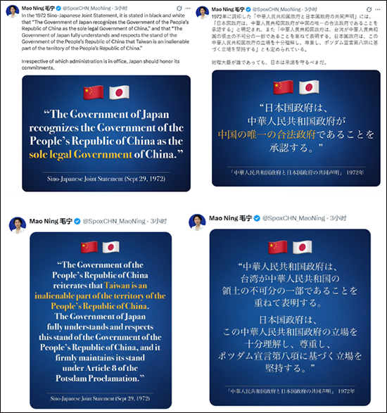 值得一提的是,昨日(16日),毛宁也在该平台上用英语、日语双语发布2组共4张海报,援引1972年《中日联合声明》中涉台内容,提醒日方:"无论谁当政,日本都必须信守承诺"。