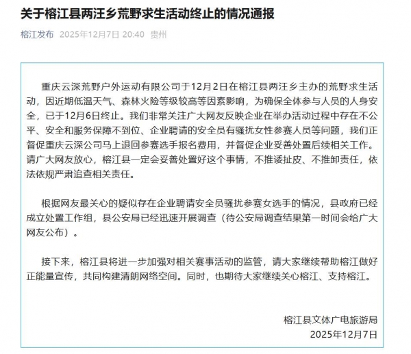 12月7日,榕江县文体广电旅游局发布情况通报:重庆云深荒野户外运动有限公司于12月2日在榕江县两汪乡主办的荒野求生活动,因近期低温天气、森林火险等级较高等因素影响,为确保全体参与人员的人身安全,已于12月6日终止。我们非常关注广大网友反映企业在举办活动过程中存在不公平、安全和服务保障不到位、企业聘请的安全员有骚扰女性参赛人员等问题,我们正督促重庆云深公司马上退回参赛选手报名费用,并督促企业妥善处置后续相关工作。