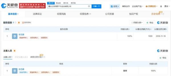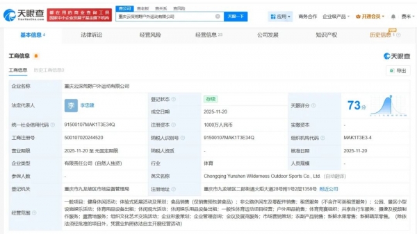 大象新闻记者查询天眼查App显示,涉事公司重庆云深荒野户外运动有限公司成立于今年11月,法定代表人为李忠建,注册资本1000万人民币,经营范围包括健身休闲活动、体验式拓展活动及策划、食品销售等,由李忠建全资持股。