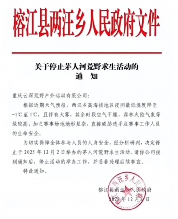 记者注意到,贵州榕江"荒野求生赛"于12月2日在贵州榕江县两汪乡正式开启。有媒体报道称,参赛报名费为1280元,共200个名额,吸引了4000人报名,冠军有10万元奖励。12月6日,比赛仅仅开赛4天后,网上便有网友晒出了两汪乡政府发出的一纸"停赛通知",通知写道"根据近期天气预报,两汪乡高海拔地区夜间最低温度降至-1℃至1℃,且伴有大雾,其余时段空气干燥,森林火险气象等级较高,加之赛事场地地形复杂,直接威胁选手及赛事工作人员的生命安全。为切实保障全体参与人员的人身安全,经分析研判,决定停止于2025年12月2日举办的茅人河荒野求生活动。"