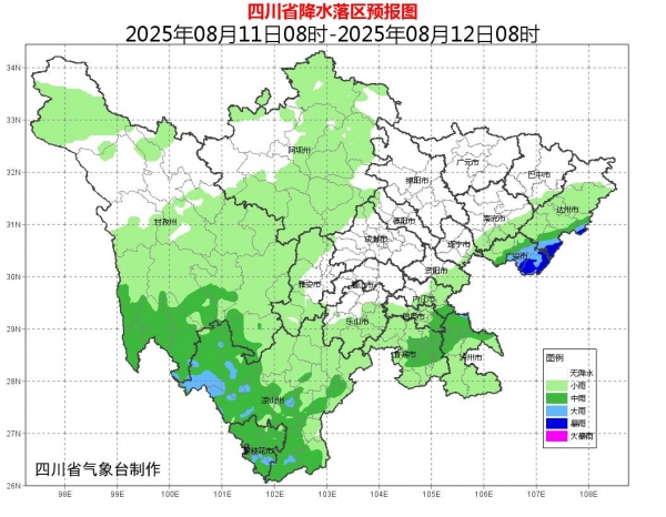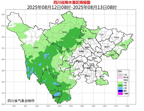 8月12日08时至13日08时,今天白天到晚上,盆地大部多云,盆周地区有雷雨或阵雨;川西高原大部和攀西地区阴天间多云有雷雨或阵雨,其中阿坝州东部南部、甘孜州中部南部和攀西地区西部南部有中到大雨。