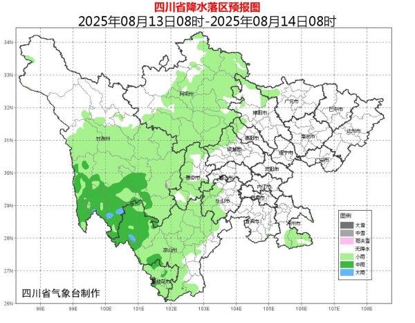 8月13日08时至14日08时,今天白天到晚上,盆地大部多云间晴,西部沿山有雷雨或阵雨;阿坝州大部、甘孜州中部南部和攀西地区多云间阴有雷雨或阵雨,其中甘孜州南部和攀西地区西北部有中雨,局部大雨。