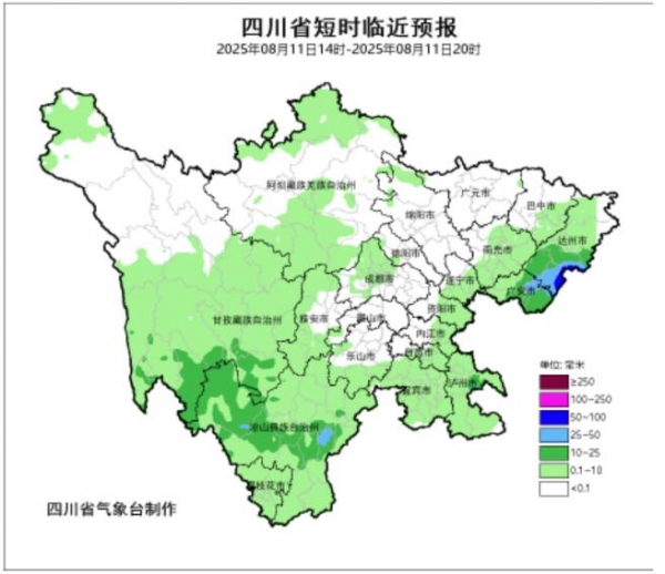 8月11日14时至20时,盆地大部多云,盆周地区有雷雨或阵雨,其中达州、广安、泸州3市的部分地方有中雨,局部大雨,个别暴雨;阿坝州北部南部、甘孜州中部南部和攀西地区阴天间多云有雷雨或阵雨,其中甘孜州南部和攀西地区西部中部有中雨,局部大雨。