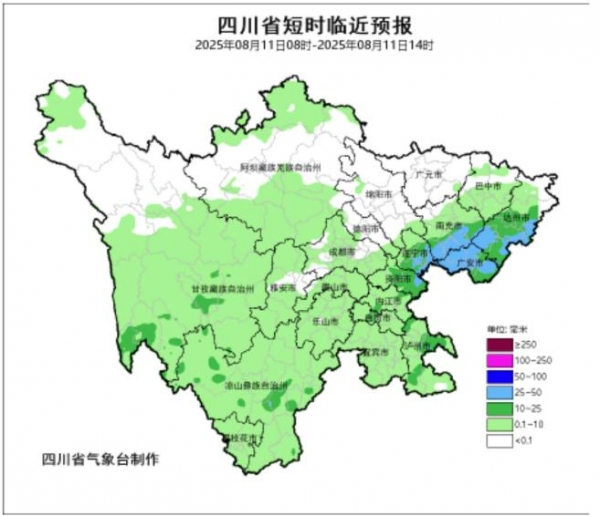 8月11日08时至14时,盆地大部多云,盆周地区有雷雨或阵雨,其中达州、广安、南充、遂宁、资阳、内江、自贡、宜宾、泸州9市的部分地方有中雨,局部大雨;阿坝州北部南部、甘孜州中部南部和攀西地区阴天间多云有雷雨或阵雨,其中甘孜州南部和攀西地区西部中部有中雨。