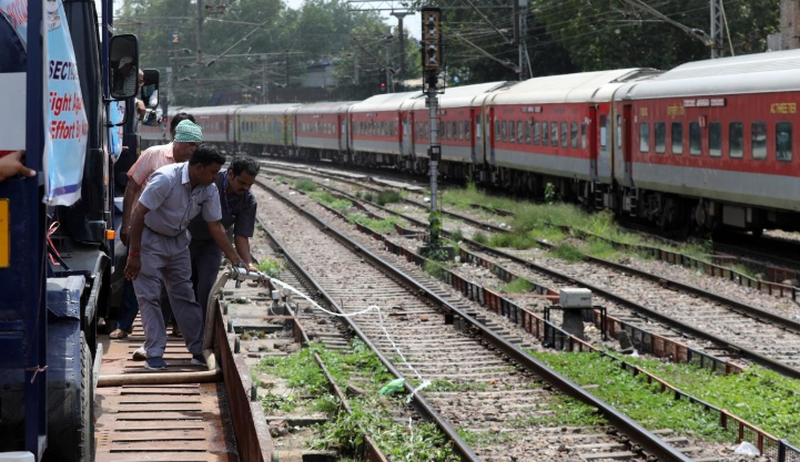 图| 当地时间2023年8月18日,印度新德里,市政工人向铁路喷洒杀虫剂