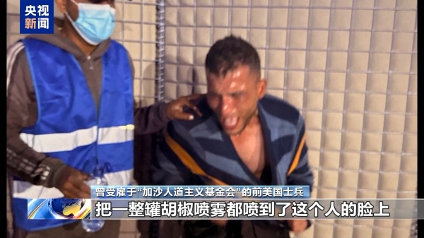 曾受雇于"加沙人道主义基金会"的前美国士兵:有一个男子跪在地上正在捡一根根面条,然后美方安保人员想把巴勒斯坦人赶走。于是他们开始大喊"嘿!快走,快离开这里"。这个男子没有武器,他不构成威胁。然后这个美国承包商雇员,把一整罐胡椒喷雾都喷到了这个人的脸上。这是致命的。