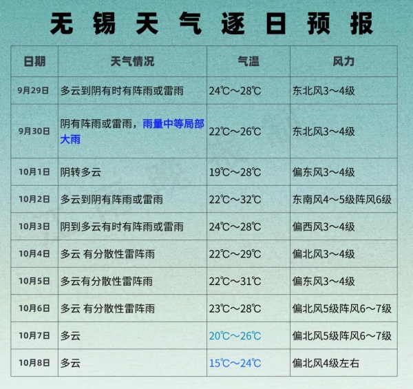 天气:9月29-30日,弱冷空气南下,无锡有一次降雨过程,其中30日雨量中等,局部大雨;10月1日天气短暂转好,2-3日午后多雷阵雨天气;4-6日以多云为主,有分散性雷阵雨;7-8日多云。另外1日、4-5日早晨局部有雾。