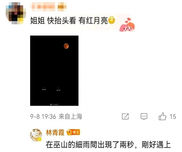 林青霞在评论区透露,原本只打算在重庆市区吃火锅,刷到网友拍的巫山红月视频,立刻改签高铁。