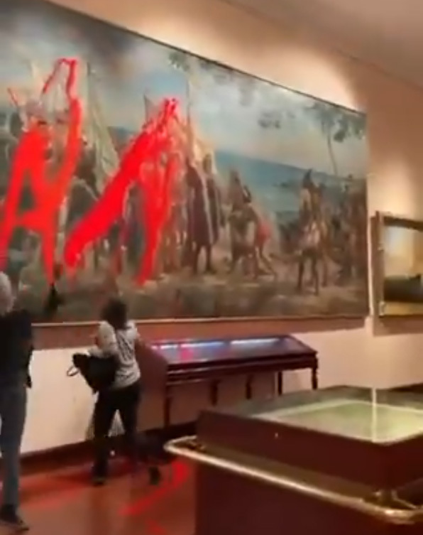 西班牙马德里海军博物馆一幅纪念哥伦布的画作被泼红漆 视频截图