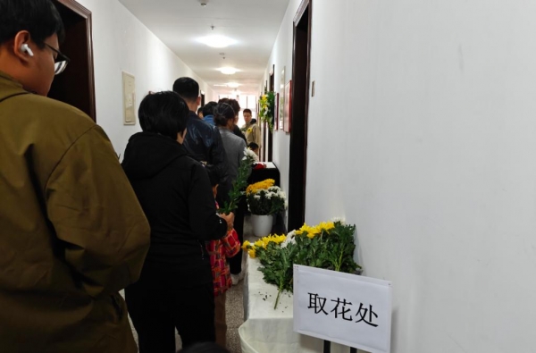 走进清华大学高等研究院的大门后,往左手边的走廊走去,能看到清华专门设置的"取花处","取花处"放着盛开着的黄菊与白菊。"取花处"附近的桌上,还放有纸和笔,供前来悼念的人留下姓名。