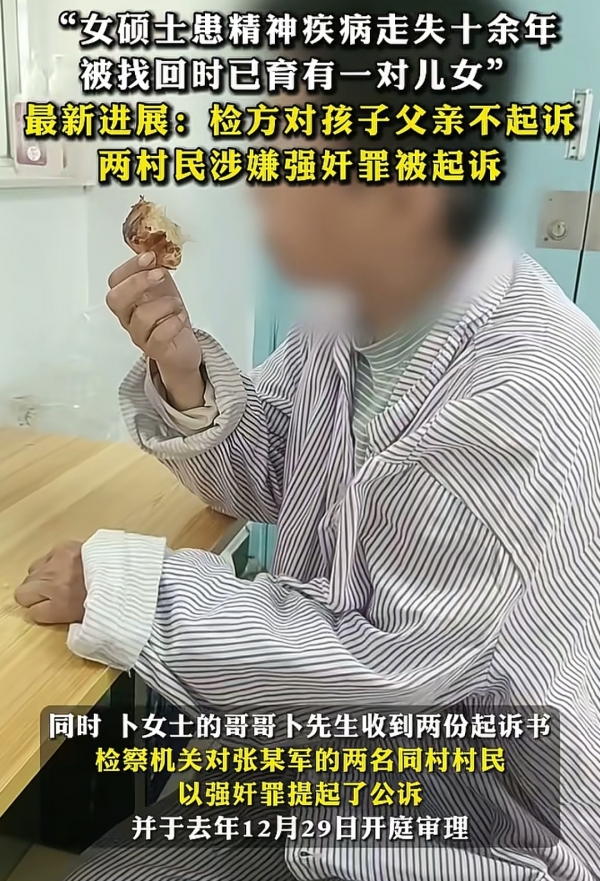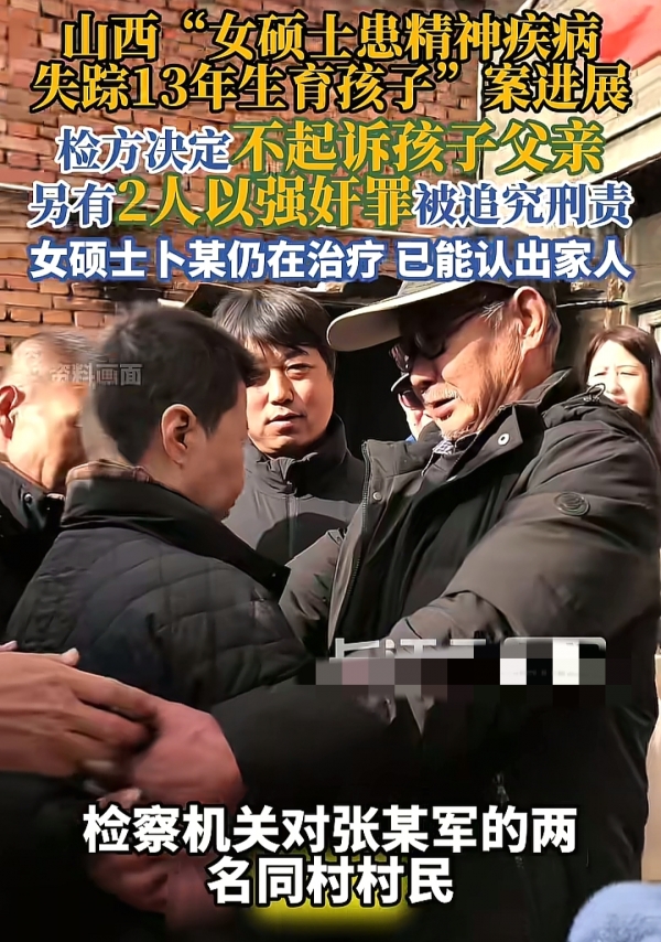 山西一名患有精神疾病的女硕士,在失踪十多年后竟被发现在偏远山村,已生育两个孩子。而将她"收留"回家的村民张某军,最近收到了检察院的"不起诉决定书";同时,同村两名男子却因涉嫌多次强奸她,被押上了法庭。