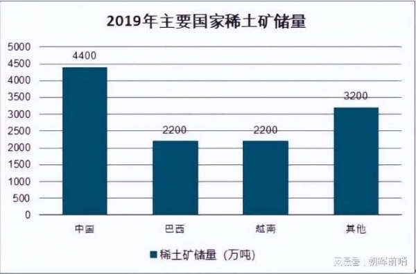 我们先来看一张图表,这张图表是2019年世界上主要国家稀土矿储量,这是以万吨来计的,排在第1位的是中国,是4400万,越南和巴西是并列第二是2200万吨,越南的稀土矿的储备还是非常大的。