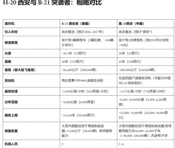 按照《国家利益》的说法,轰-20的机长约20米、翼展45米,最大起飞重量可达200吨,最大航程约1万公里,最大有效载荷达到45吨,最高飞行速度约为1175公里/小时。在这些核心指标上,美媒认为轰-20整体性能"至少不逊于,部分指标优于"B-21。更关键的是,美方分析强调,轰-20并非单纯复制B-2或B-21的"亚音速飞翼隐身路线",而是可能在隐身基础上,追求更高的航速和更灵活的突防方式。